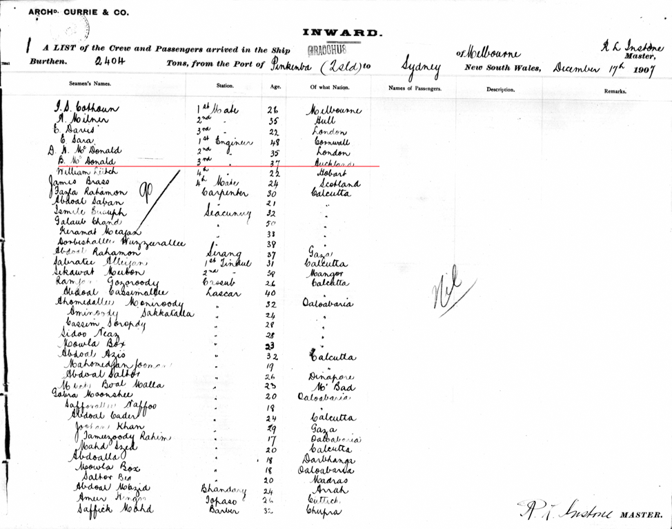 Passenger list Gracchus 17/12/1907 port of Sydney