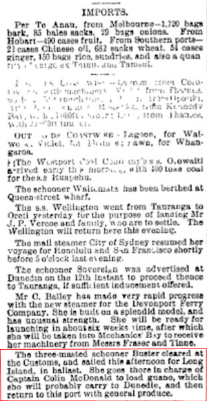 The three-masted schooner Buster cleared at the Customs, and sailed this afternoon for Long Island, in ballast. She goes there in charge of Captain Colin McDonald to load guano, which she will probably carry to Dunedin and then return to this port with general produce.