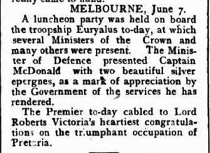 THE COLONIES AND THE WAR MELBOURNE, June 7. A luncheon party was held on board the troopship Euryalus to-day, at which several ministers of the Crown and many others were present. The Minister of Defence presented Captain McDonald with two beautiful silver epergnes, as a mark of appreciation by the government of the services he has rendered. |
