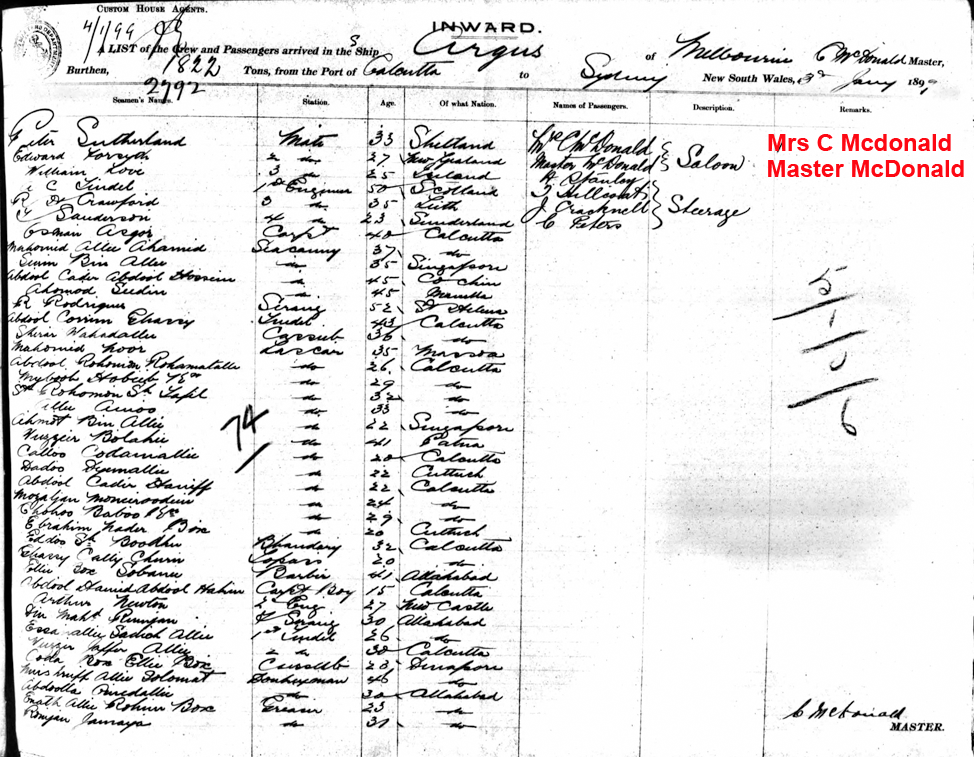 Passenger list Argus 03/01/1899 port of Sydney