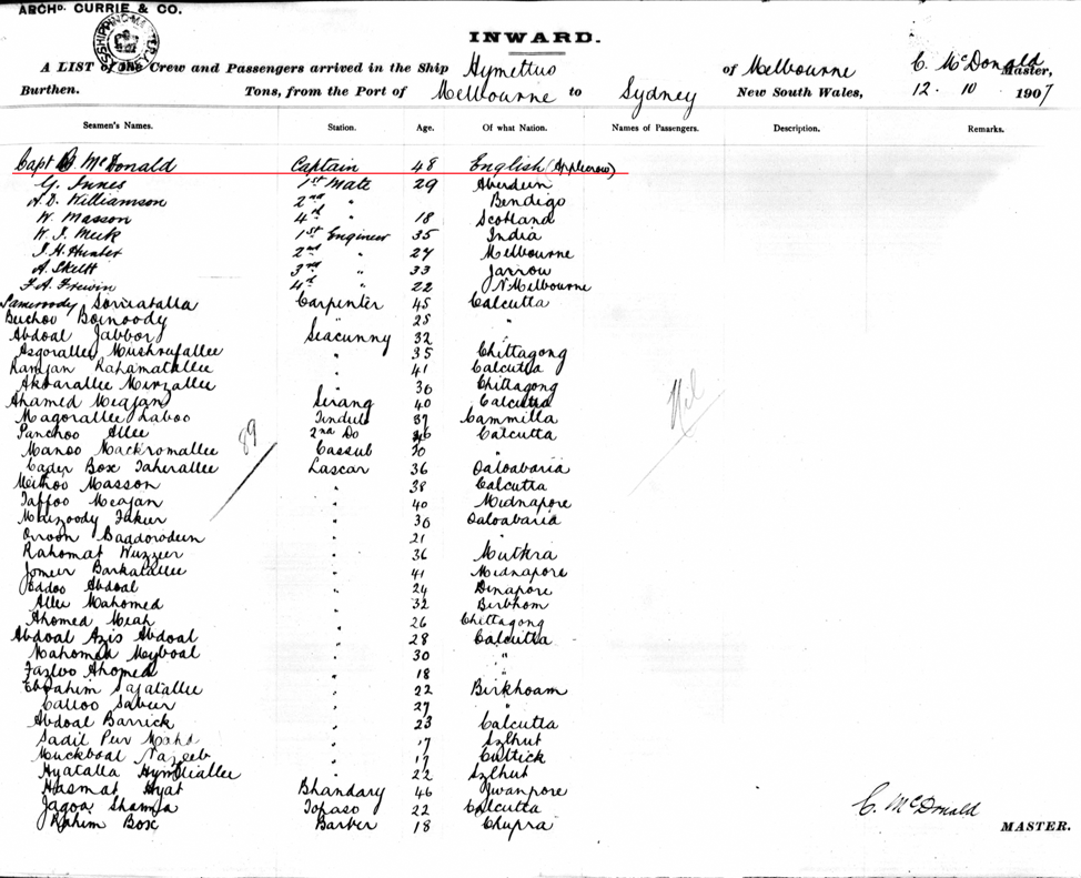 Passenger list Hymettus 12/10/1907 port of Sydney