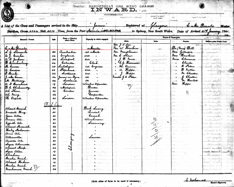 Passenger list Janus 31/01/1921 port of Sydney