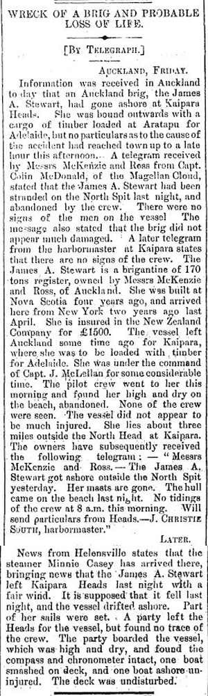 The, vessel left Auckland some time ago for Kaipara, where, she was to be loaded with, timber for Adelaide. She was under the command of Capt. J. McLell an for some considerable time. The pilot crew went to her this morning and found her high and dry on the beach, abandoned. None of the crew were seen. The vessel did not appear to be much injured. She lies about three miles outside the North Head at Kaipara. The owners have subsequently received the following telegram: "Messrs McKenzie and Ross.:- The James A, Stewart got ashore outside the North Spit yesterday. Her masts are gone. The hull came on the beach last night. No tidings of the crew at 8 a.m. this morning. Will send particulars from Heads. - J. Christie South, harbormaster.