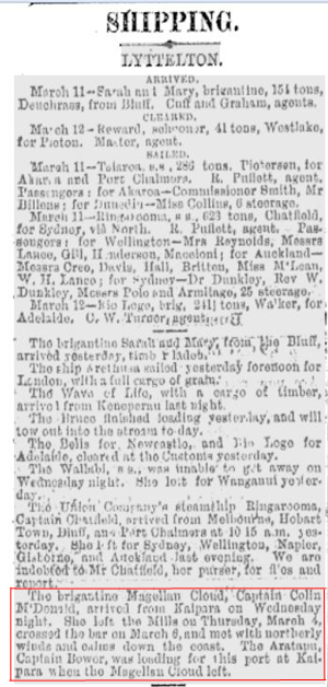 The brigantine Magellan Cloud, Captain Colin McDonald, arrived from Kaipara on Wednesday night. She left the Mills on Thursday, March 4, crossed the bar on March 6, and met with northerly winds and calms down the coast. The Aratapu, Captain Bower was loading for this port at Kaipara when the Magellan Cloud left.