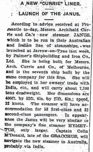 Acording to advice received at Fremantle to-day, Messrs. Archibald Currie and Co.'s new steamer JANUS, which is to be run in their Australian and Indian line of steamships, was launched at Jarrow-on-Tyne last week, by Palmer's Shipbuilding and Iron Co., Ltd. She is being built for Messrs. Arch. Currie and Co., of Melbourne, and is the seventh ship built by the same company for this firm. She will be employed in her owners' trade with India, etc., and will carry about 7,700 tons deadweight. Her dimensions are 400ft by 52ft. 6in. by 27ft. 6in.; speed, 12 knots. The steamer will have accommodation for 58 first-class and 32 second-class passengers. In appearance the Janus will be very similar to the company's fine steamer HYMETTUS, only larger. Captain Colin McDonald, late of the GRACCHUS, will navigate the new steamer to Australia, probably. via India. |