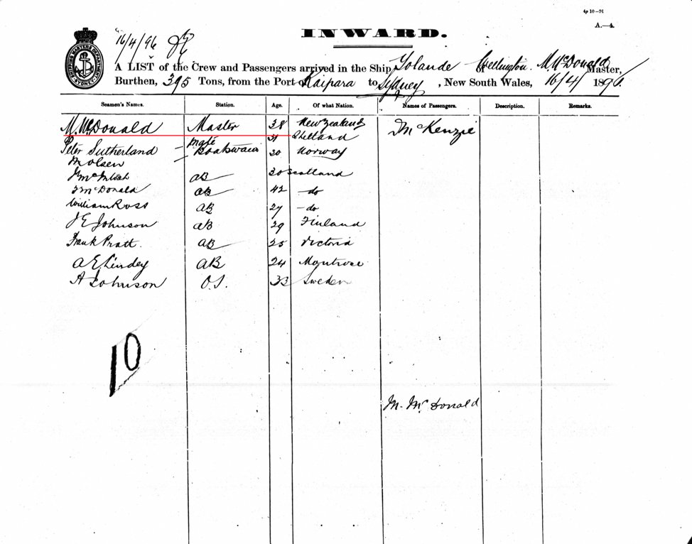 Passenger list Yolande 16/04/1896 port of Sydney