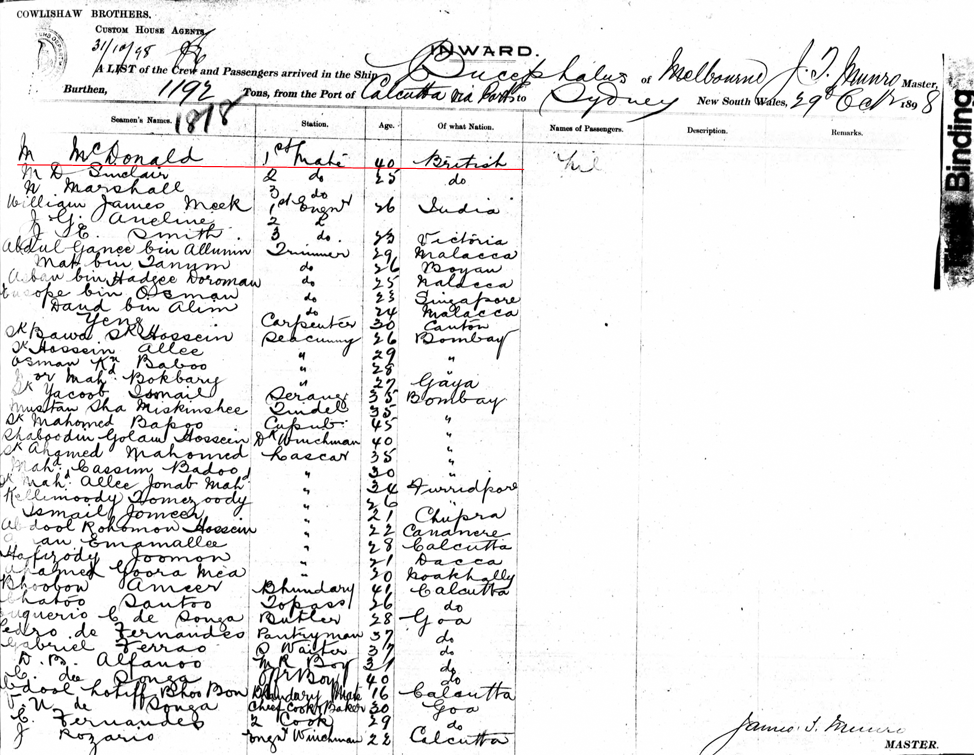 Passenger list Bucephalus 29/10/1898 port of Sydney