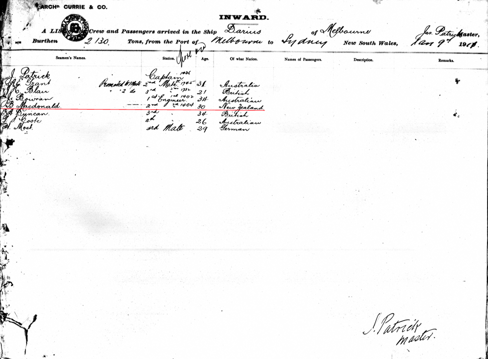 Passenger list Darius 09/01/1911 port of Sydney