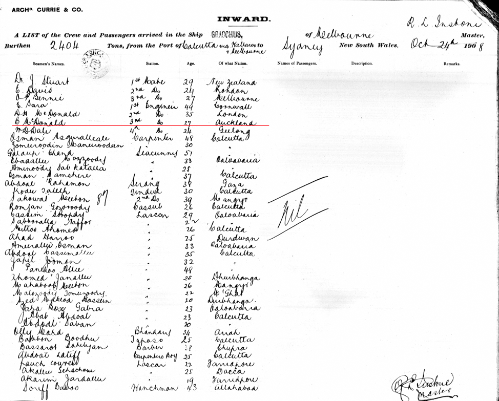Passenger list Gracchus 24/10/1908 port of Sydney