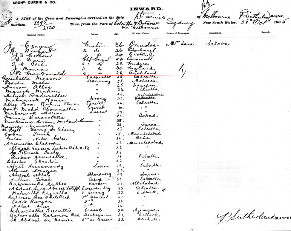 Passenger list Darius 28/10/1905 port of Sydney