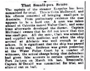 THE SMALL-POX SCARE The captain of the steamer Euryalus has been committed for trial. This is Colin McDonald, and his offence consisted of bringing small-pox to Australia. From preliminary evidence the case appears to be a hard one. A man was taken aboard at Calcutta named Walter Clark, and some time afterwards developed the disease. Captain McDonald swears that he did not know that this was small-pox. All the same, Clark was attended and supplied with medicine, and when the ship arrived at Adelaide was well enough to go ashore. It is significant that the ship was passed in the usual way. Evidence was given yesterday at the Water Police Court by a number of witnesses, the actual charge being that the defendant had given false answers to certain questions in Port Jackson on march 8th last. Eventually Captain McDonald was committed for trial and allowed out on bail. |