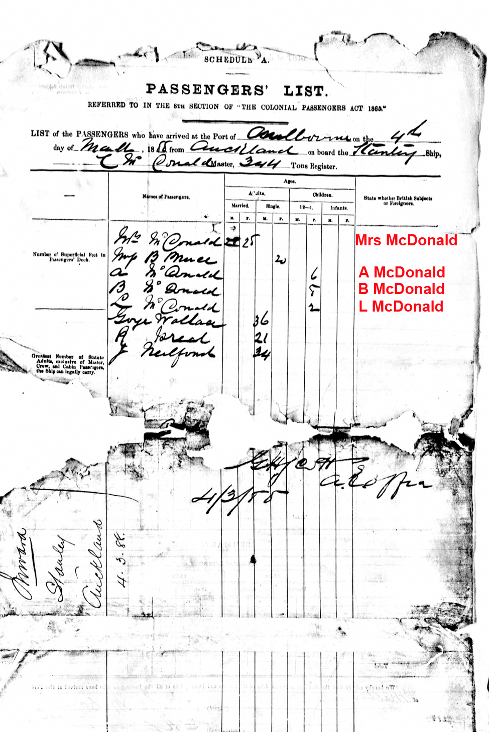 Passenger list Stanley 04/03/1888 port of Melbourne