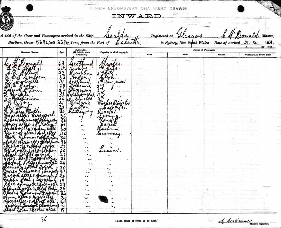 Passenger list Sealda 27/12/1921 port of Sydney