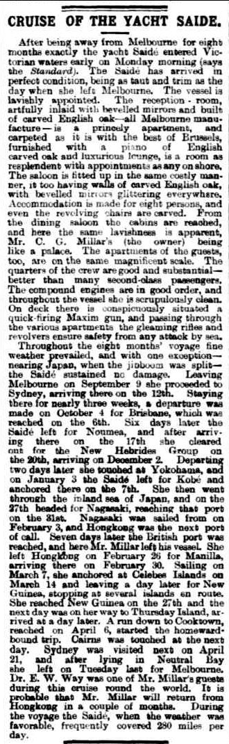 After being away from Melbourne for eight months exactly the yacht Saide entered Victorian waters early on Monday morning (says the Standard). The Saide has arrived in perfect condition, being as taut and trim as the day when she left Melbourne. The vessel is lavishly appointed. The reception room, artfully inlaid with bevelled mirrors and built of carved English oak—all Melbourne manufacture -is a princely apartment, and carpeted as it is with the best of Brussels, furnished with a piano of English carved oak and luxurious lounge, is a room as resplendent with appointments as any onshore. The saloon is fitted up in the same costly manner, it too having walls of carved English oak, with bevelled mirrors glittering everywhere. Accommodation is made for eight persons, and even the revolving chairs are carved. From the dining saloon the cabins are reached, and here the same lavishness is apparent, Mr. C. G. Millar's (the owner) being like a palace. The apartments of the guests, too, are on the same magnificent scale. The quarters of the crew are good and substantial— better than many second-class passengers. The compound engines are in good order, and throughout the vessel she is scrupulously clean. On deck there is conspicuously situated a quick-firing Maxim gun, and passing through the various apartments the gleaming rifles and revolvers ensure safety from any attack by sea. Throughout the eight months' voyage fine weather prevailed, and with one exception— nearing Japan, when the jibboom was split— the Saide sustained no damage. Leaving Melbourne on September 9 she proceeded to Sydney, arriving there on the 12th. Staying there for nearly three weeks, a departure was made on October 4 for Brisbane, which was reached on the 6th. Six days later the Saide left for Noumea, and after arriving there on the 17th she cleared out for the New Hebrides Group on the 20th arriving on December 2. Departing two days later she touched at Yokohama, and on January 3 the Saide left for Kobe and anchored there on the 7th. She then went through the inland sea of Japan, and on the 27th headed for Nagasaki, reaching that port on the 31st. Nagasaki was sailed from on February 3, and Hongkong was the next port of call. Seven days later the British port was reached, and here Mr. Millar left his vessel. She left Hongkong an February 26 for Manilla, arriving there on February 30. Sailing on March 7, she anchored at Celebes Islands on March 14 and leaving a day later for New Guinea, stopping at several islands en route. She reached New Guinea on the 27th and the next day was on her way to Thursday Island, arrived at a day later. A run down to Cooktown, reached on April 6, started the homeward bound trip. Cairns was touched at the next day. Sydney was visited next on April 21, and after lying in Neutral Bay she left on Tuesday last for Melbourne. Dr. E. W. Way was one of Mr. Millar's guests during the cruise round the world. It is probable that Mr. Millar will return from Hongkong in a couple of months. During the voyage the Saide, when the weather was favorable, frequently covered 280 miles per day.