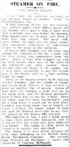 It was at first thought that the blaze was among the contents of the No. 1 hold, and the first attack was commenced from the deck. Lines of hose were dragged up, and the men fought their way to the sides of the forehatch and then poured their streams into the heart of the smoke, but it was quite impossible, to see the actual seat of the flames, and for a time nothing could be done. Then, as the flames seemed to be making further headway and the clouds of smoke and steam grew thicker, it. was decided to open up another line of attack. Lines of hose were led through a wide port on to the main deck, and the firemen gradually worked their way to the. No. 2 hold. Here the smoke was still more impenetrable, and Tho contents of Nos. 1 and 2 holds seem to have been practically destroyed, and it is feared that the vessel may have suffered structurally. Tho cargo in these holds is stated to be mainly Jute and chaff. the Janus is a steel screw steamer of 1824 (?) tons, belonging to the British India Steam Navigation Company. She arrived from Calcutta on December 5, under the command of Captain McDonald.