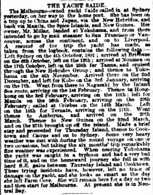 THE YACHT SAIDE The Melbourne-owned yacht Saide called in at Sydney yesterday, on her way to the home port She has been on a trip up to China and Japan, via the New Hebrides, and back via Manila, the Spice Islands and New Guinea. Her owner, Mr Millar, landed at Yokohama and from there intended to go by mail steamer to San Francisco or Vancouver, across the continent, and on to Liverpool.