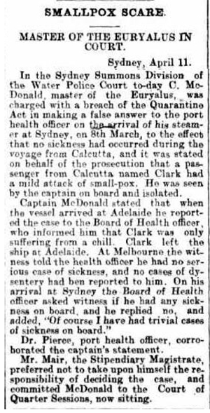 SMALLPOX SCARE MASTER OF THE EURYALUS IN COURT Sydney, April 11. In the Sydney Summons Division of the Water Police Court to-day C McDonald, master of the Euryalus, was charged with a breach of the Quarantine Act in making a false answer to the port health officer on the arrival of his steamer at Sydney, on 8th March, to the effect that no sickness had occurred during the voyage from Calcutta, and it was stated on behalf of the prosecution that the passenger from Calcutta named Clark had a mild attack of small-pox. He was seen by the captain on board and isolated. Captain McDonald stated that when the vessel arrived at Adelaide he reported the case to the Board of Health officer, who informed him that Clark was only suffering from a chill. Clark left the ship at Adelaide. At Melbourne the witness told the health officer he had no serious case of sickness, and no cases of dysentery had been reported to him. On his arrival at Sydney the Board of Health officer asked witness if he had any sickness on board, and he replied no, and added, "Of course I have had trivial cases of sickness on board." Dr Pierce, port health officer, corroborated the captains statement. Mr Mair, the Stipendiary Magistrate, preferred not to take it upon himself the responsibility of deciding the case, and committed McDonald to the Court of Quarter Sessions, now sitting. |