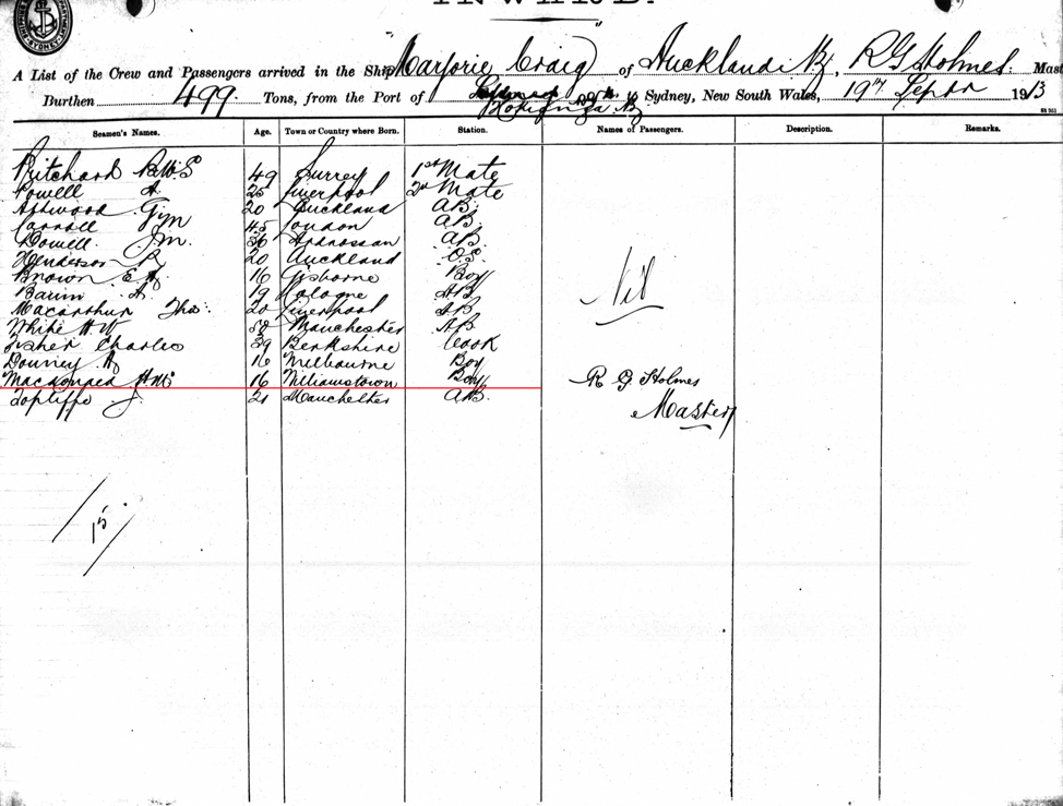 Passenger list Marjorie Craig 19/09/1913 port of Sydney