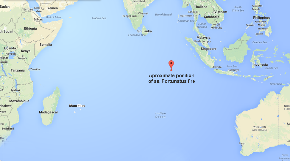 The first day out a S.W. monsoon wind, with a moderate to rough sea was encountered, while similar conditions prevailed on the 27th. During the first two days after crossing the equator fresh south-east trade winds and south-east head seas were experienced. Battling and ploughing through a dirty head sea, the Fortunatus, about 8.30 p.m., on July 30 was in longitude 6 degrees 24 miles south, and latitude 90 degrees 14 miles east. It was at this time that the engineer and the officer on watch saw smoke issuing from the ventilators forward of the engine-room above the shelter deck.