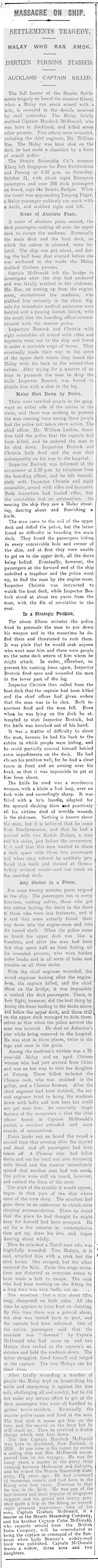 MASSACRE ON SHIP. SETTLEMENTS TRAGEDY. MALAY WHO RAN AMOK. THIRTEEN PERSONS STABBED. AUCKLAND CAPTAIN KILLED. The full horror of the Straits Settlements tragedy on board the steamer Klang, when a Malay ran amok armed with a kis, is revealed in the details received by mail yesterday. The Malay fatally stabbed Captain Murdoch McDonald, who was born in Auckland, and killed seven other persons. Five others were wounded, including the chief engineer, Mr. William Rae. The Malay was later shot on the deck he had made a shambles by a force of armed police. Tho Straits Steamship Co.'s steamer Klang left Singapore for Port Swettenham and Penang at 4.30 p.m. on Saturday, October 31, with about eight European passengers and over 200 deck passengers on board, says the Straits Budget. When the vessel was approaching Tanjong Pagar, a Malay passenger suddenly ran amok with a knife, and stabbed right and left. Scene of Absolute Panic. A scene of absolute panic ensued, the deck passengers rushing all over the upper deck to escape the madman. Eventually the main deck and the boat deck, on which the saloon is situated, were isolated. The ship was put about, and during the half hour that elapsed before she was anchored in the roads the Malay stabbed thirteen persons. Captain McDonald left the bridge to investigate after the ship had anchored and was fatally stabbed in the abdomen. Mr. Rae, on coming up from the engineroom, encountered the madman, who stabbed him seriously in the chest. Signals for immediate medical assistance were hoisted and a passing launch hailed, with the result that the boarding officer communicated with the marine police. Inspectors Bostock and Christie with eight constables all armed with rifles and bayonets went out to the ship and found it under a veritable reign of terror. They eventually made their way to the stern of the upper deck where they found the Malay with his back to the second-class cabins. After trying for a quarter of an hour to persuade the man to drop the knife Inspector Bostock was forced to disable him with a shot in the leg. Malay Shot Down by Police. There were terrified people in the gangways on either side of the cabins in the stern, and there was nothing to prevent the man running loose among these people had the police not taken stern action. The chief officer. Mr. William Lutkin, therefore told the police that the captain had been killed, and he ordered the man to be shot down. Inspectors Bostock and Christie both fired and the man died subsequently on his way to the hospital. Inspector Bostock was informed-of the occurrence at 5.30 p.m. by telephone from the boarding officer, and he left immediately with Inspector Christie and eight constables, armed with rifles and bayonets. Both inspectors had loaded rifles, but the constables had no ammunition. On nearing the ship they saw a Malay shouting, dancing about and flourishing a knife. The man came to the rail of the upper deck and defied the police, but the latter found no difficulty in boarding the main deck. They found the passengers hiding in every conceivable hole and corner of the ship, and at first they were unable to get on to the upper deck, all the doors being bolted. Eventually, however, the passengers at the forward end of the ship unbolted a trapdoor and the police went up, to find the man by the engine room. Inspector Christie was instructed to watch the boat deck, while Inspector Bostock stood at about ten paces from the man, with the file of constables in the rear. In a Strategic Position. For about fifteen minutes the police tried to persuade the man to put down his weapon and in the meantime he defied them and threatened to rush them. It was plain that he would stab anyone who went near him and there were people on the same deck astern of him whom he might attack. In order, therefore, to prevent his running loose again, Inspector Bostock fired once and wounded the man in the lower part of the leg. Inspector Christie then called from the boat deck that the captain had been killed and the chief officer had given orders that the man was to be shot. Both inspectors fired and the man fell. Even when he was lying on the deck he attempted to stab Inspector Bostock, but the knife was knocked out of his hand. It was a matter of difficulty to shoot the man, because he had his back to the cabins in which people were hiding, and he could partially conceal himself behind some impedimenta on the deck. He had chosen his position well, for he had a clear space in front and an awning over his head, so that it was impossible to get at him from above. The knife he used was a murderous weapon, with a blade a foot long, over an inch wide and exceedingly sharp. It was fitted with a kris handle, adapted for the upward slashing blow and practicaly all his victims died of terrible wounds in the abdomen. Nothing is known about the man, but it is believed that he came From Bandjermassin, and that he had a quarrel with two Kedah Malays, a man find his sister, just before the occurrence. It is said that this man wanted to share a deck space with these two passengers and when they refused he suddenly produced this knife and slashed at them—luckily without result—and ran amok on the crowded deck. Any Shelter in a Storm. For some twenty minutes panic reigned on the ship. The passengers ran in every direction, seeking safety, those who got into cabins locking the doors in the faces of those who were less fortunate, and it is said that some actually found their way down into the engine-room and into tho tunnel shaft. When the police came on board the upper deck was like a shambles, and after the man had been shot they spent half an hour finding all the wounded persons, who were hidden under bunks and in all sorts of holes and crannies on all three decks. With the chief engineer wounded, the second engineer looking after the engineroom, the captain killed, and the chief officer on the bridge, it was impossible to control th