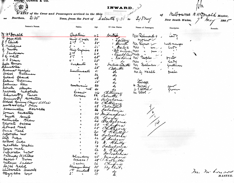 Passenger list Fortunatus 07/05/1905 port of Sydney