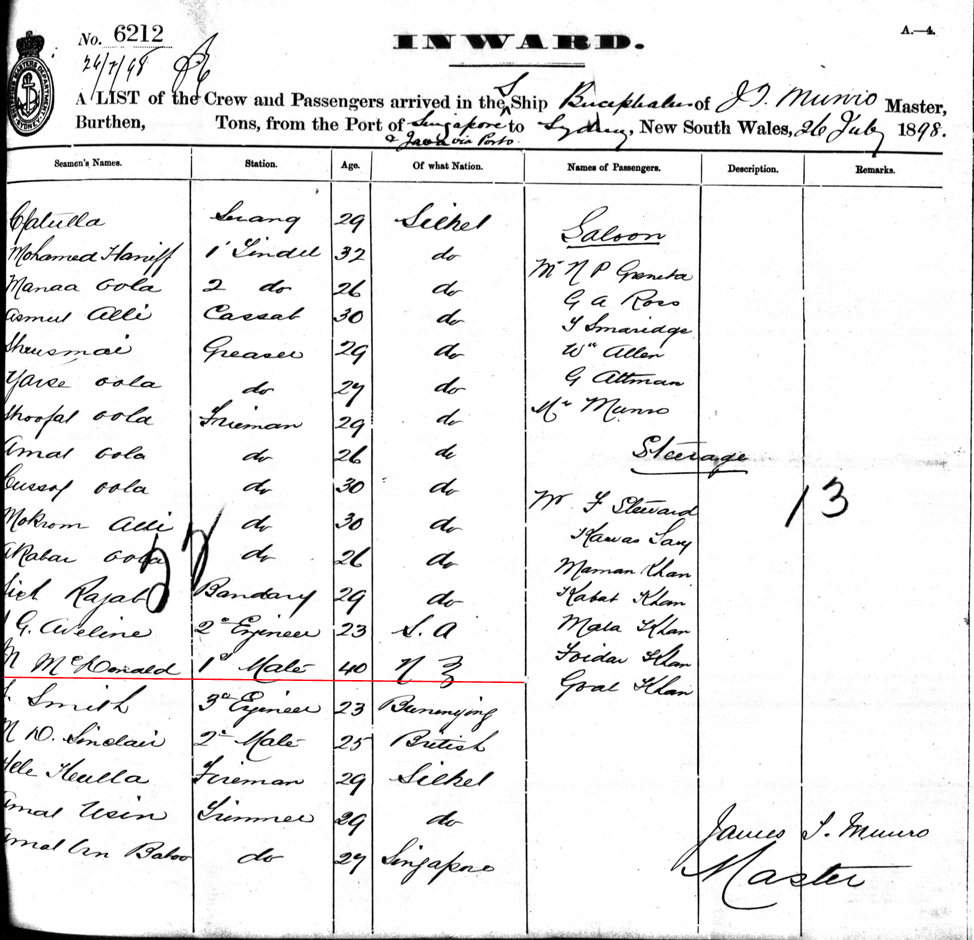 Passenger list Bucephalus 26/06/1898 port of Sydney