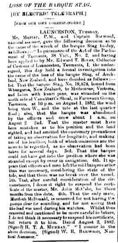 LOSS OF THE BARQUE STAG. [BY ELECTRIC TELEGRAPH.] [ FROM OUR OWN CORRESPONDENT.] LAUNCESTON, TUESDAY. Mr. Murray, P.M, and Captain Barwood, nautical assassor, gave the following decision as to the cause of the wreck of the barque Stag to-day, as follows :-" In pursuance of the Act of the Parliament of Tasmania, 38 Vict., No. 2, and having been applied to by Mr. Edward T. Boyes, Collector of Customs of Launceston, Tasmania, I, the undersigned, this day held a formal investigation into the cause of the loss of the barque Stag, of Auckland, New Zealand, and have decided as follows :- 1st. That the barque Stag, No. 19,878, bound from Whangaroa, New Zealand, to Melbourne, Victoria, and laden with kauri pine, was stranded on the north side of Vansettar's Shoal, in Furneaux Group, Tasmania, at 10 p.m. on August 1, 1882, the wind being then W., and the tide at the last quarter flood ; also, that the barque was abandoned by the officers and crew about 1 a.m. ou August 2.2nd. That the master must have been mistaken as to his position and the land sighted, and had omitted the customary precautions of taking an observation for longitude, and making use of his leadline, both of which omissions are the more to be regretted, as no observation had been taken for several days. 3rd. That the barque could not have got into the position where she was stranded except by error in navigation. 4th. It appears the officers and men left the said barque earlier than was necessary, considering the state of the tide, and that there was no break over the vessel. 5th. That, after careful consideration of the circumstances, I deem it right to suspend the certificate of the master, Mr John McCabe, for three months from this date. 6th. That the only mate, Murdoch McDonald, is censured for not having the pumps clear for sounding, and for not seeing that the lead was used during his watches. Whilst thus consured and cautioned to be more careful In future, I do not think it necessary to suspend his certificate, but return it to him. Dated August 2, 1882. (Signed) H. T. A. MURRAY." " I concur in the above decision. (Signed) W. R. BARWOOD, Nautical Assessor. |