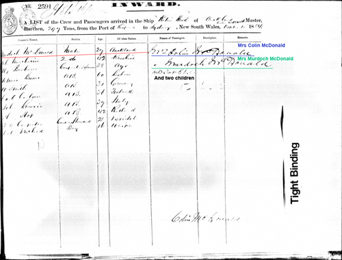 lists Mrs McDonald and 2 children and Mrs Murdoch. The actual passenger list (above) shows Colin as Master, Murdoch McDonald as Mate and passengers Mrs Colin McDonald,Mrs Murdoch McDonald and two children. This trend also continued in Colin's steam days as shown in his passenger lists.