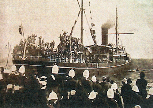 Colin experienced the first of his wars when he embarked Col Tom Price's 2nd Victoria Mounted Rifles in ss. Euryalus bound for the Boer War. The Euryalus set sail on the 13th of January 1900. A letter sent home by one of the soldiers notes "the Captain of the boat fills in an odd evening with a lot of views from a magic lantern." There is also an interesting story of this voyage in the book THE LION OF SCOTLAND. It details an incident between the ships cook and the soldiers and the novel way Colin dealt with it. Details of both of Euryalus's Boer War voyages can be seen here.