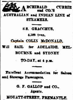 It is not known exactly when he was appointed, however the shipping intelligence of 1903 notes Capt Colin McDonald as "Commodore" of the Currie fleet, when there was a "triangular change of masters" including Colin leaving Euryalus and Taking command of the ss. Gracchus and his brother Murdoch Taking over the Euryalus. Early 1904, in Gracchus, Colin rescued the crew of the sailing ship Ladmene which had struck a rock and sunk off the coast of Burma. |