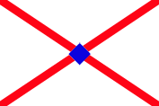 House flag: Red diagonal cross on a white background with a blue diamond at the centre.