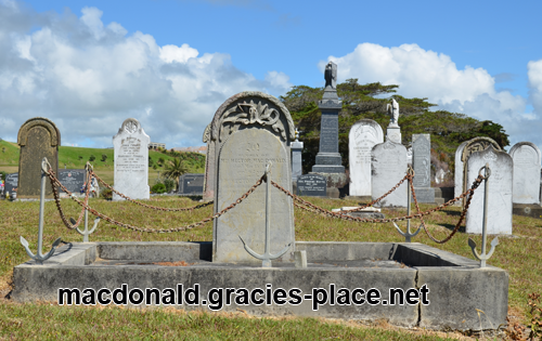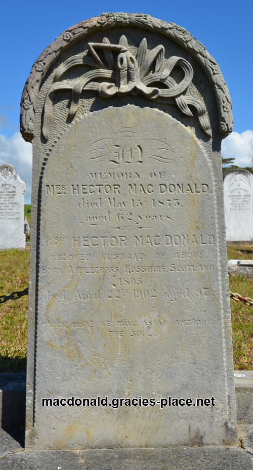 Hector lived out his final years with his son Norman at Waipu, passing away on the 21st of April 1902 at the ripe old age of 97 years. Hector was buried in the Waipu Cemetery (plot 351) on the 23rd of April, where his wife Ann had been buried many years before. It is unknown when the headstone was added to the grave, however it gives the surname of both Ann and Hector as MAC DONALD!